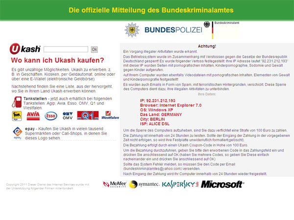 heute innerhalb von 15 Minuten kamen zwei Betroffene zur Betrugsanzeige, die sich beim surfen den BKA oder Bundespolizei- Trojaner eingefangen haben.